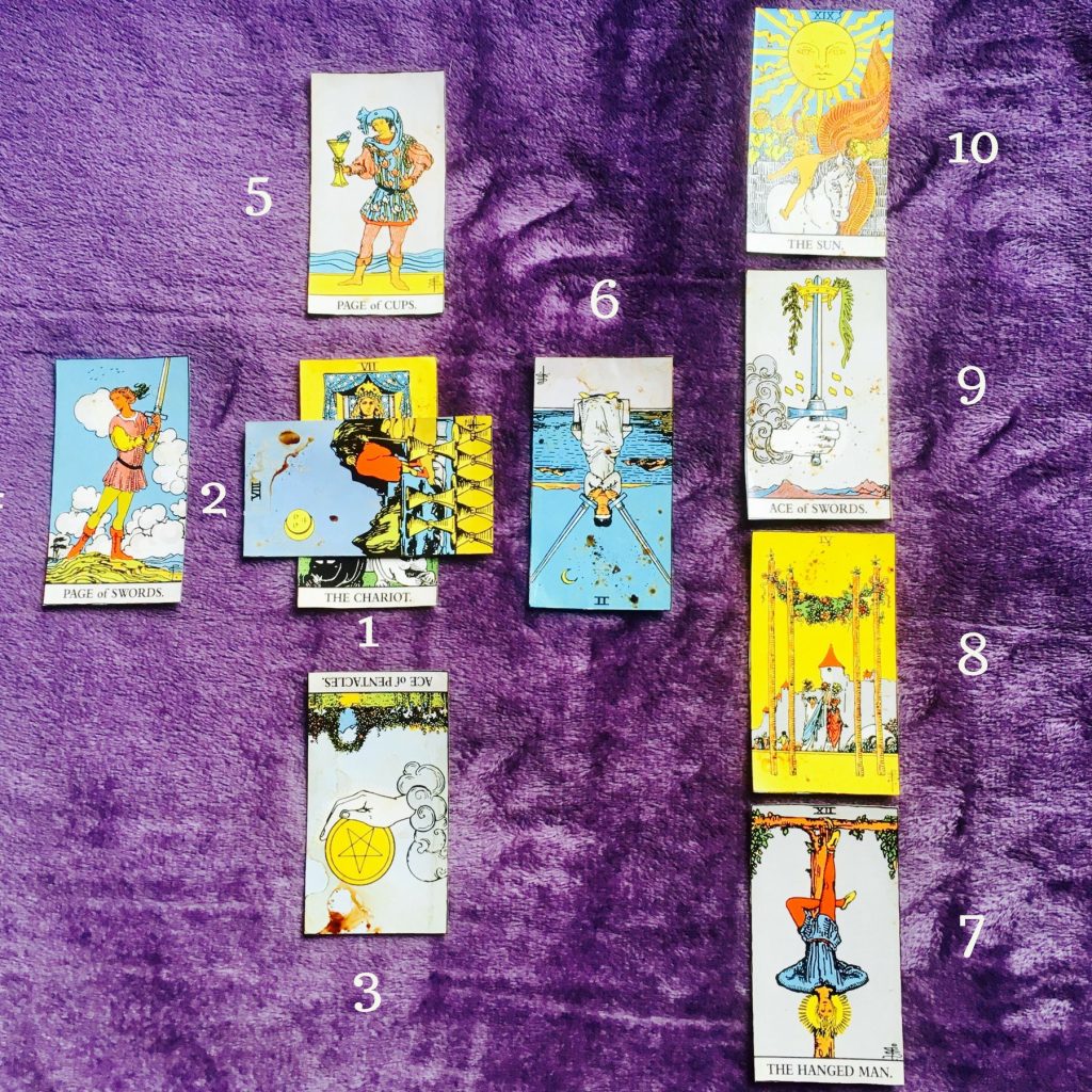 A second aspect of applying the Tarot for divination is that of the spread, or the layout of the cards when giving a reading. Each placement of a card represents an aspect of life. There are many spreads like the horseshoe, the 3 card spread and so on, but one of the most revealing is that of the Celtic Cross, which is spread of 10 cards (sometimes with an extra card).